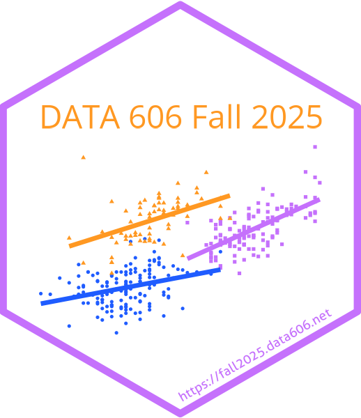 The course syllabus located on this website here: https://fall2025.data606.net/course/syllabus.html I will post all course materials there. Blackboard will be used primarily for submitting assignments. Please read the syllabus carefully! Send us any questions you may still have about the course.